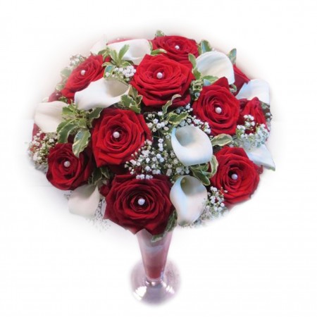 Šopek Eros je lep prosto vezan šopek. Sestavlja ga 15 velikih vrtnic iz ekvadorja in 10 belih kal, ki naredijo šopek zelo eleganten. Dodatno je kot polnilo uporabljeno razno zelenje in umetni dodatki.